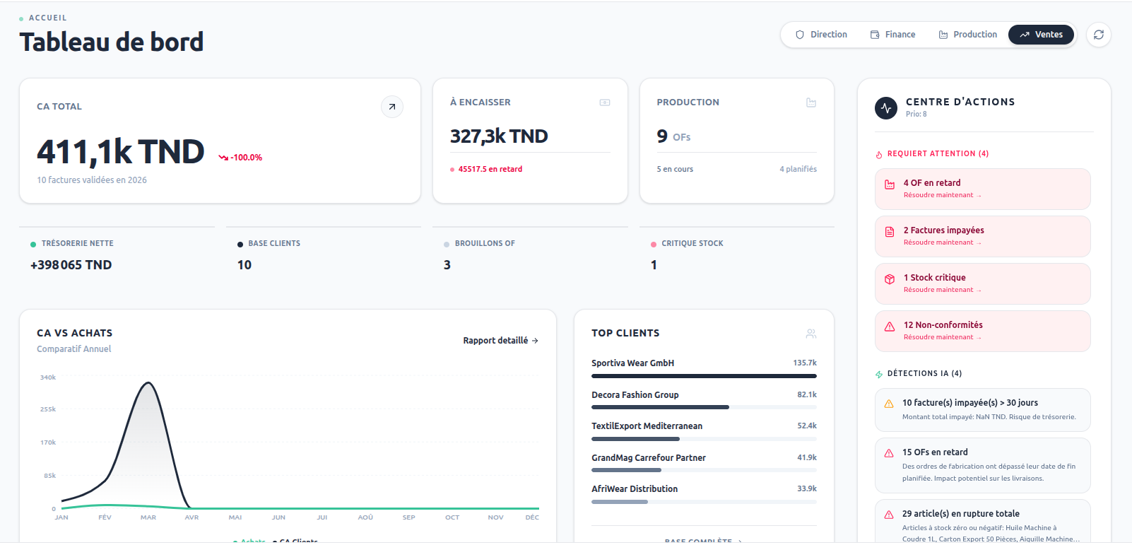 Vue d'ensemble granulaire : Ventes, Achats, Pipeline Client, Objectifs. Reprenez le contrôle complet avec une interface unifiée.